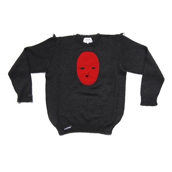 THE LONDON LEATHERMANのアイコニックなレザーマスクのシルエットのアップリケを施したモヘアセーターです。各所の縫い代を表に出したインサイドアウト風の仕様になっています。